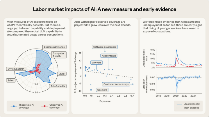 Un nuevo estudio de Anthropic analiza la brecha entre la capacidad teórica de la Inteligencia Artificial y su uso real en las empresas, introduciendo una métrica de «exposición observada» basada en datos de uso profesional.